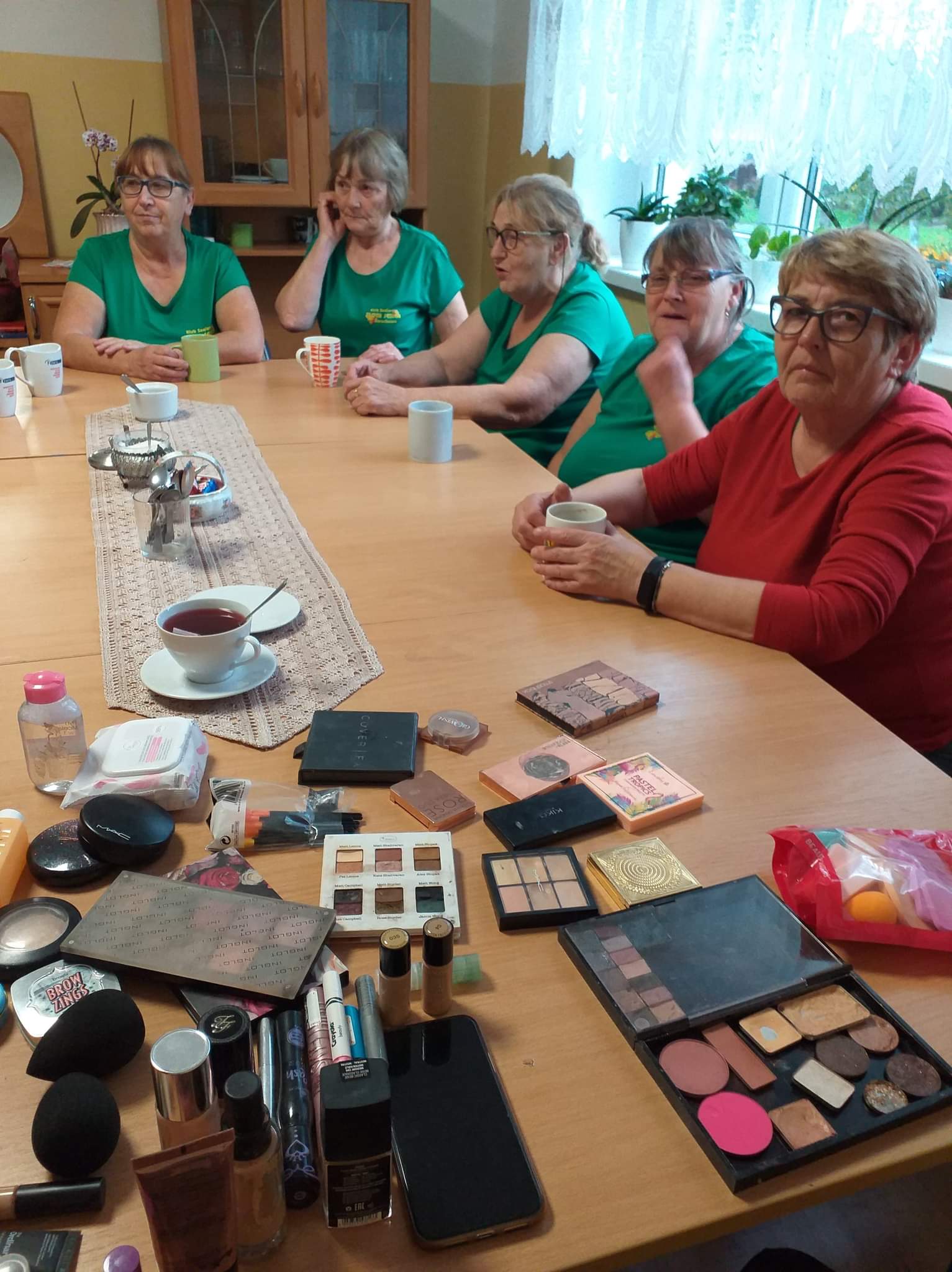 W klubie w dniu 14 października odbyły się również warsztaty makijażu. Warsztaty poprowadziła Pani Klaudia Stańczyk. W ramach warsztatów Pani Klaudia opowiedziała uczestnikom jak dbać o piękno i urodę skóry dojrzałej. W czasie warsztatów instruktorka zaprezentowała jak prawidłowo wykonać makijaż wieczorowy dostosowany do różnych typów cery. Seniorki, jak i seniorzy byli bardzo zadowoleni ze spotkania. Po zajęciach instruktażowych mieli okazję zasięgnąć indywidualnych porad na temat doboru odpowiednich kosmetyków do ich cery.
