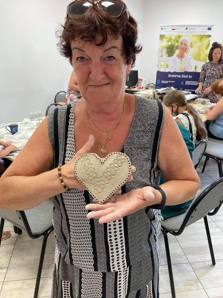 Pani z Rady Seniorów prezentująca wykonane z gliny serce.W dniu 11 i 24 sierpnia br. w sali konferencyjnej Ośrodka Pomocy Społecznej w Główczycach odbyły się warsztaty ceramiczne dla wolontariuszy z projektu pn. „ Srebrna Sieć”.